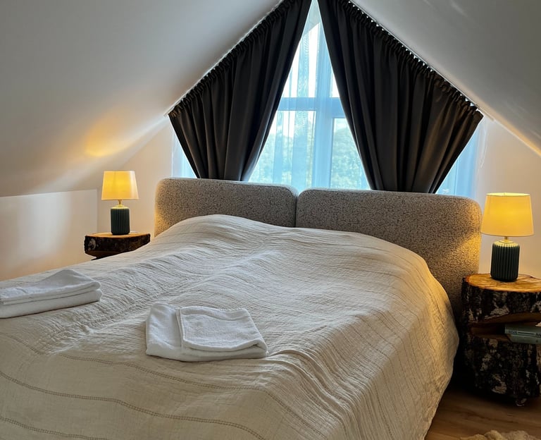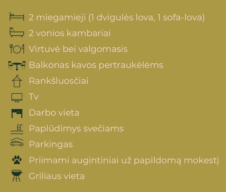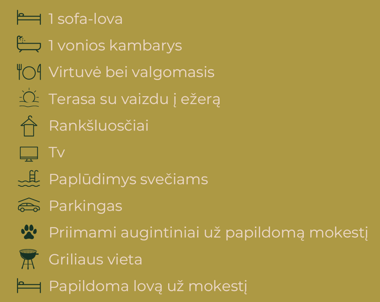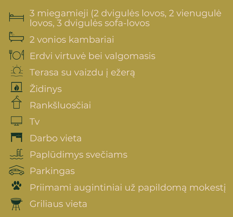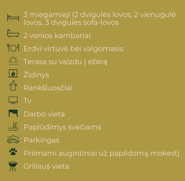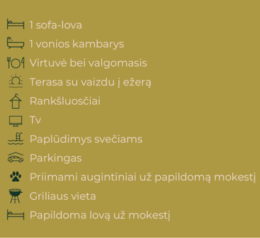 Naujai įrengti apartamentai, puikiai pritaikyti šeimai iki 4 asmenų, suteiks ramų ir jaukų apsistojimą. Tai erdvūs kelių aukštų apartamentai, kuriuose rasite modernią pilnai įrengtą virtuvę, valgomojo zoną ir komfortišką miegamąjį. Iš langų atsiveria nuostabūs vaizdai tiek į ežerą, tiek į laukus, leidžiantis mėgautis gamtos ramybe ir tylumu. Šis apartamentas idealiai tiks tiems, kurie nori pabūti su šeima ir atsipalaiduoti, mėgaujantis ramybe ir gražiais aplinkos vaizdais.